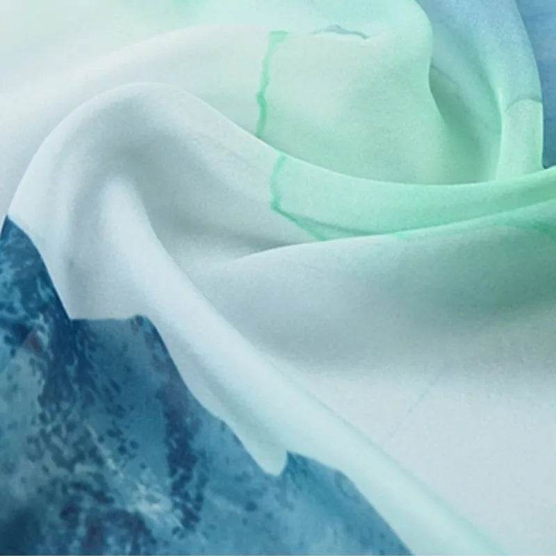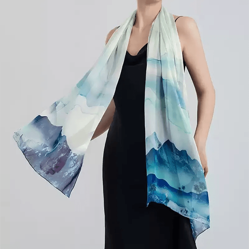 Woven in 100% mulberry silk, this 180 x 50 cm scarf flows with the soft poetry of Jiangnan’s landscapes. Mist-kissed mountains rise in ink-wash layers—their lines dancing from pale dawn to shadowed dusk—while breeze-caressed rivers ripple through hand-rolled hems. Wear a watercolor dream: where silk meets cloud, and every drape whispers of mist-laden hills.