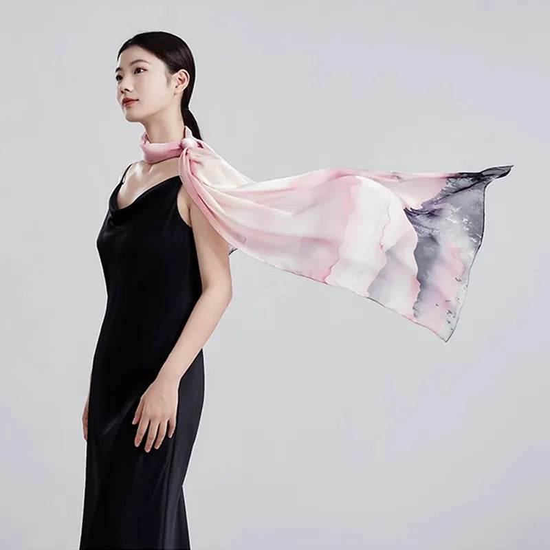 100% Mulberry Silk Ink Wash Landscape Design Long Scarf 180 x 50 Cm