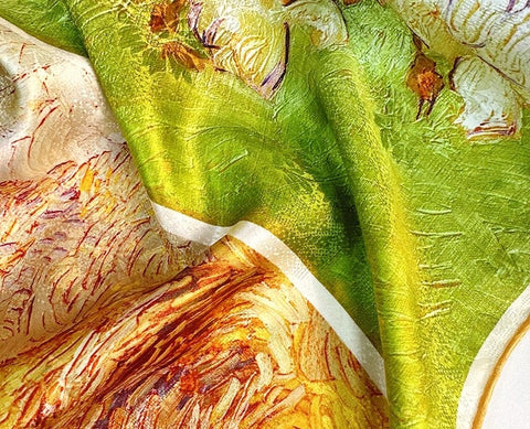 【Heavyweight Mulberry Silk】This product is made from 14-momme heavyweight mulberry silk. The texture is smooth and delicate, with a silky and natural drape. The luster is warm and subdued, creating a subtle and elegant touch, and allowing the print to exude vibrancy and sophistication.