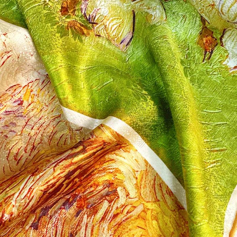 【Heavyweight Mulberry Silk】This product is made from 14-momme heavyweight mulberry silk. The texture is smooth and delicate, with a silky and natural drape. The luster is warm and subdued, creating a subtle and elegant touch, and allowing the print to exude vibrancy and sophistication.