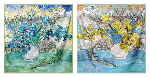 Iris, the epitome of elegance. Our Iris silk scarf blooms with a unique grace, its delicate silk evoking the gentle fragrance of a blossoming spring.