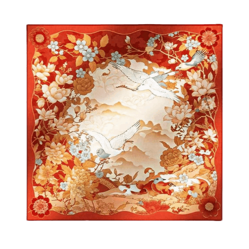 Inspired by the prestigious title “Jade Hall,” symbolizing excellence, and adorned with magnolias, crabapple blossoms, and peonies, this scarf embodies wealth and prosperity. Drawing from the Forbidden City’s tapestry “Jade Hall Prosperity,” it features flourishing flowers and dancing cranes, symbolizing continuous blessings and fortune.