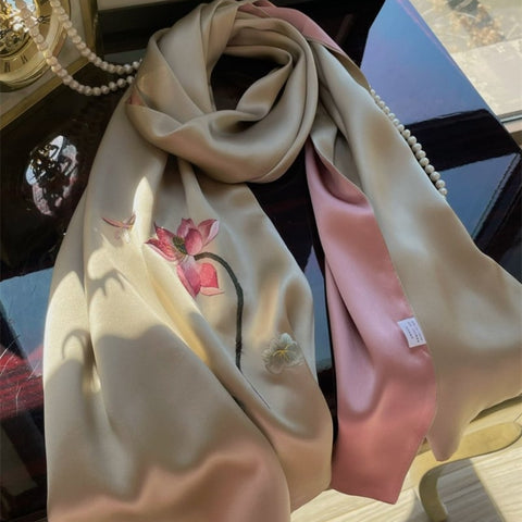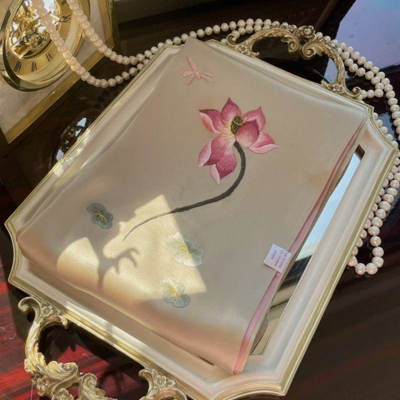 Handmade Su Embroidery 16 Momme Silk Scarf Lotus 155x35cm